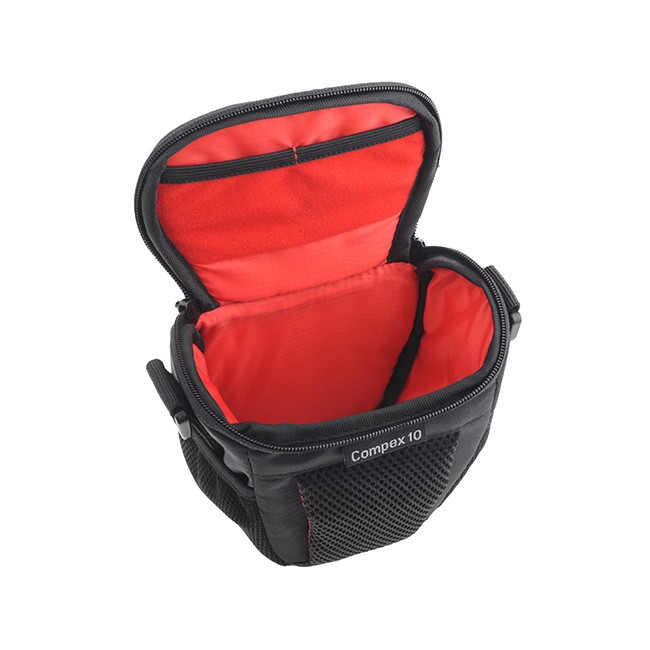 Op de voorkant van de tas is er een vak met rits voor kleine accessoires. Aan de buitenkant bevinden zich twee open zijvakken. Aan de binnenkant van het deksel zijn twee kleine vakjes voor een extra geheugenkaart of een schoonmaakdoekje. Dankzij de rood gekleurde voering aan de binnenkant zijn uw spullen in de tas goed zichtbaar en makkelijk te vinden.